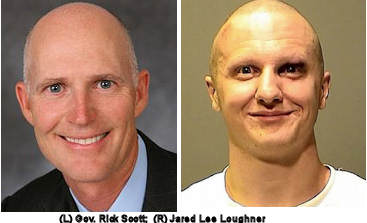 My first thought when I saw Rick Scott’s photograph soon after he took office on January 4, 2011 was that he looked like he had been separated at birth from the Tucson shooter Jared Loughner who went on a rampage about the same time. They both have that weird glint in their eyes that says “this dude is crazy!”