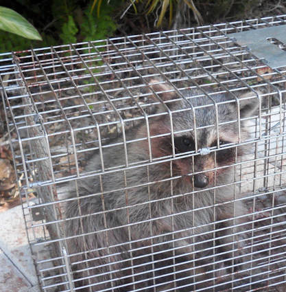 Raccoons are cunning creatures and sometimes manage to eat the bait and get away without dropping the trapdoor, but if you’re persistent, like other criminals they will eventually slip up. I’ve also caught two feral cats and a ‘possum in the trap. I just let them go, figuring they weren’t doing any harm, although the damn ‘possum just lay there playing, well, possum and refused to budge until I propped open the door and went away. He eventually got up and slunk off into the bushes.