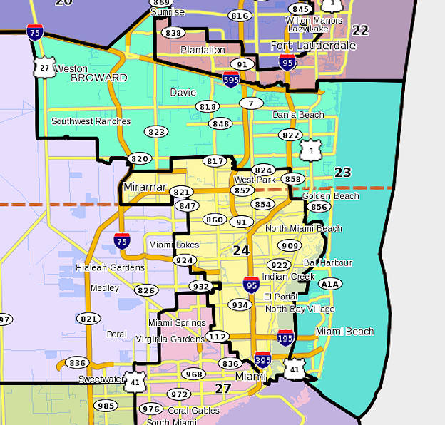 The L-shaped redrawn district covers most of the inhabited parts of Broward County south of I-595 and then hooks south to include the ocean beach communities all the way to South Beach in Miami-Dade. Unlike other districts that include parts of Miami-Dade, this one has an Anglo white plurality—almost 50 percent. Hispanics are about 37 percent of the voting age population, but only about a fourth of Hispanics in the district are Cuban in origin. Less than one-eighth of residents are black. The official demographic data from the redistricting website doesn’t include this kind of information, but the district obviously includes a substantial Jewish and gay population.