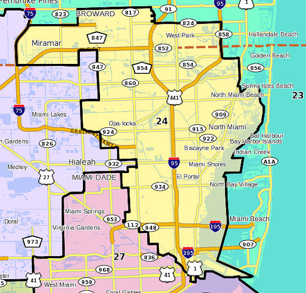 The redrawn District 24—which, full disclosure, is my district—is unusual in South Florida because it is majority black and therefore presumptively a “safe” Democratic seat. It runs from downtown Miami through the historic black neighborhoods of Overtown, Liberty City, and Brownsville through Opa-Locka and Little Haiti and includes North Miami, North Miami Beach, and Miami Gardens (all of which also have large numbers of Haitian-Americans) into far southern Broward County as far as Miramar. About 55 percent of the voting age population is black. Another 30 percent are Hispanic (only about one-fourth of them Cuban), Only about one-eighth of the residents are Anglo whites—mostly in the neighborhoods east of Biscayne Boulevard like Morningside and Belle Meade and in largely white municipalities like Miami Shores and Biscayne Park.