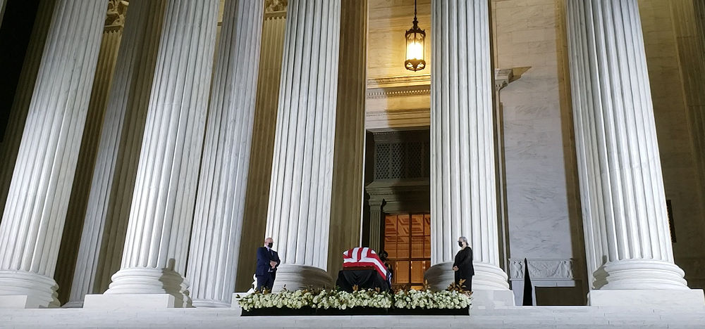 This morning, I watched the ceremony where her body was placed in state in the rotunda of the Capitol. The Republican leaders of the House and Senate were absent. Had they been there, the hypocrisy would have been unbearable, because as the ceremony was going on they were preparing to ram through a yet-unnamed replacement for Ginsburg before the presidential election less than 6 weeks away. Trump, of course, was absent as well. The day before he had made a perfunctory appearance at the Supreme Court, where he was greeted by the crowd with a chorus of boos and chants of “Vote Him Out”.
